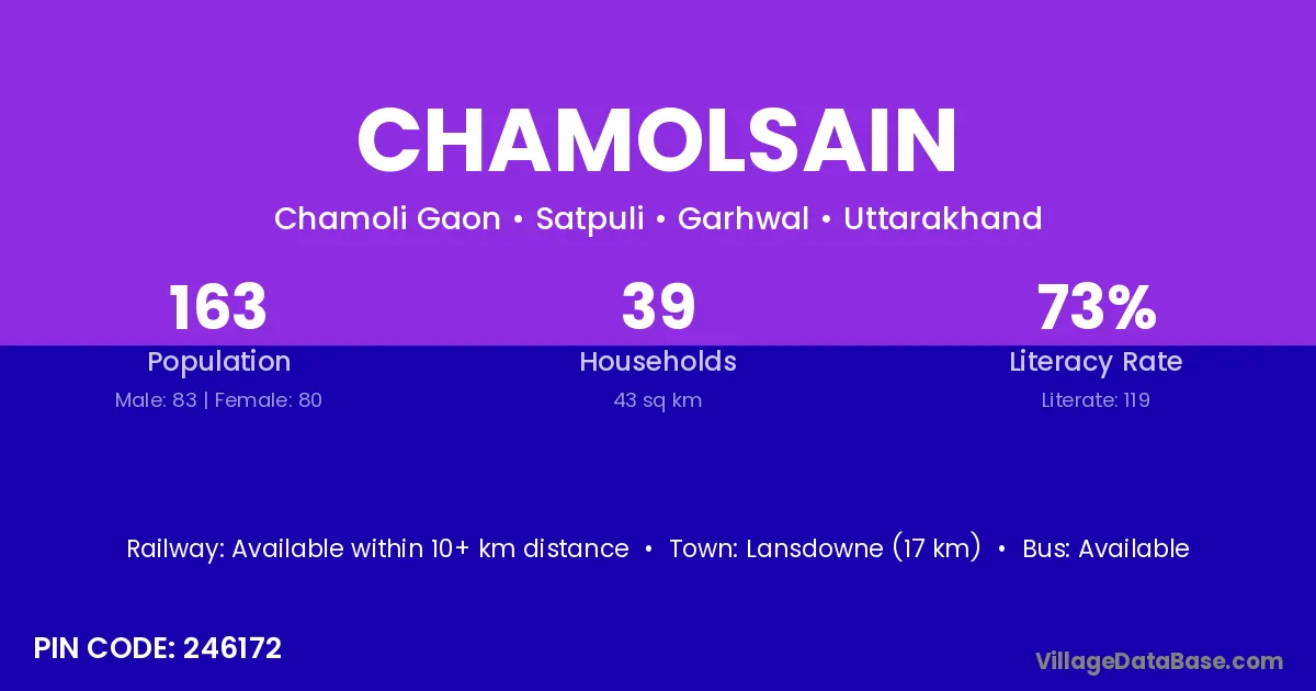 Lansdowne (17 km) is the nearest town to Chamolsain village for major economic activities and is located approximately 17 km away.