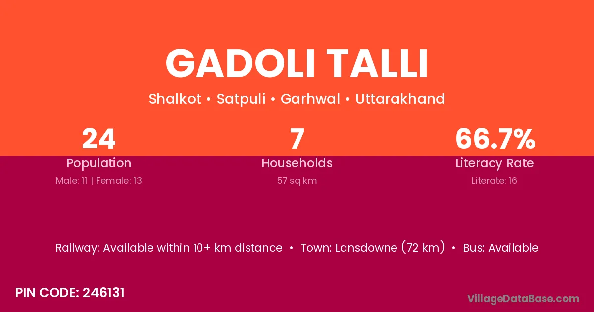 Lansdowne (72 km) is the nearest town to Gadoli Talli village for major economic activities and is located approximately 72 km away.