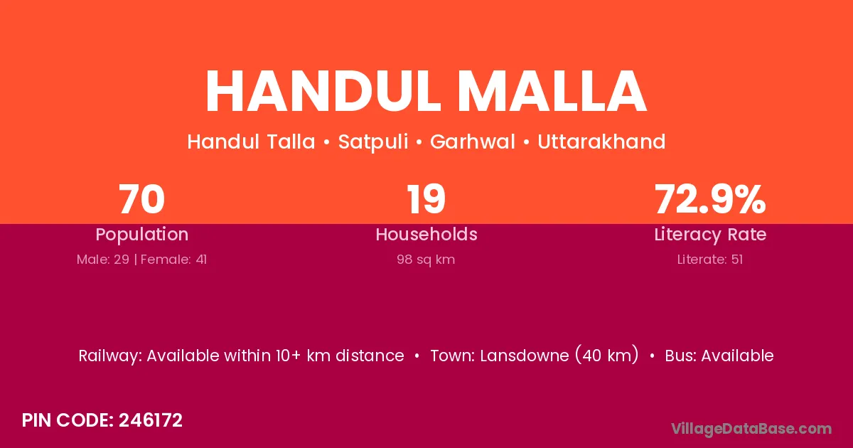 Lansdowne (40 km) is the nearest town to Handul Malla village for major economic activities and is located approximately 40 km away.