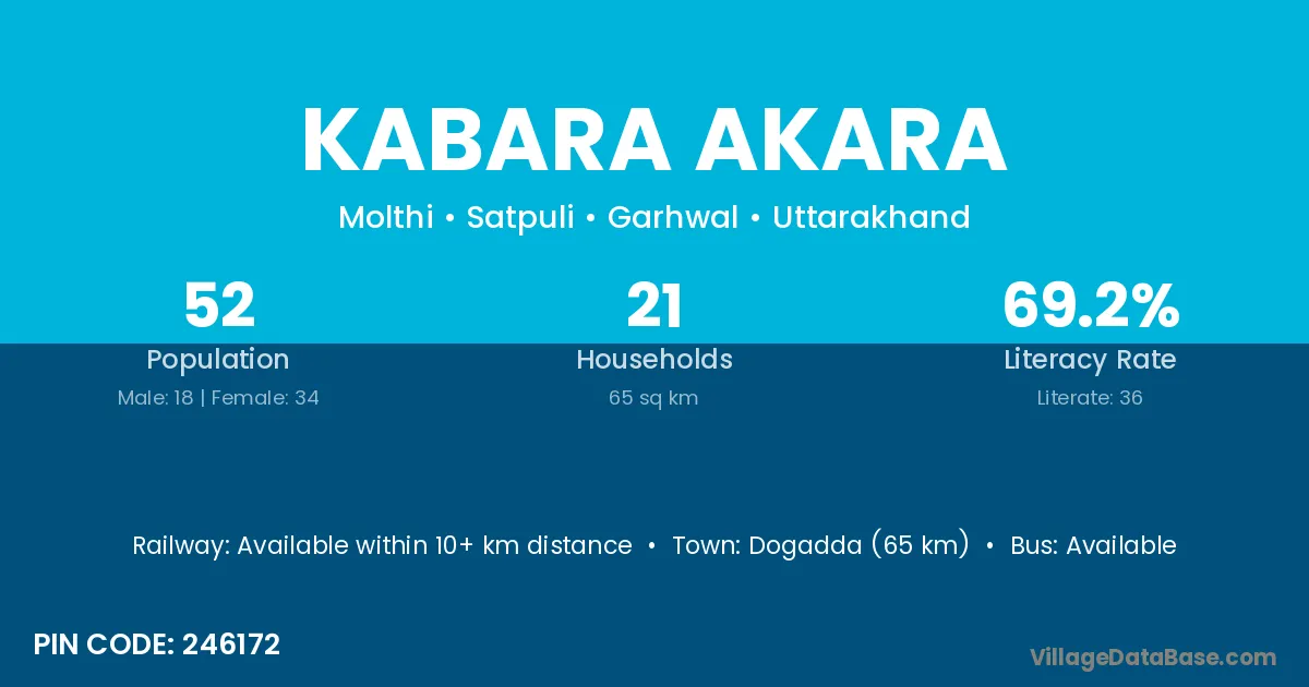 Dogadda (65 km) is the nearest town to Kabara Akara village for major economic activities and is located approximately 65 km away.