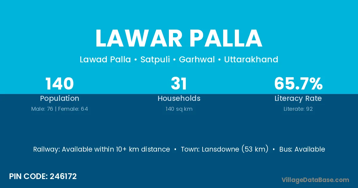 Lansdowne (53 km) is the nearest town to Lawar Palla village for major economic activities and is located approximately 53 km away.