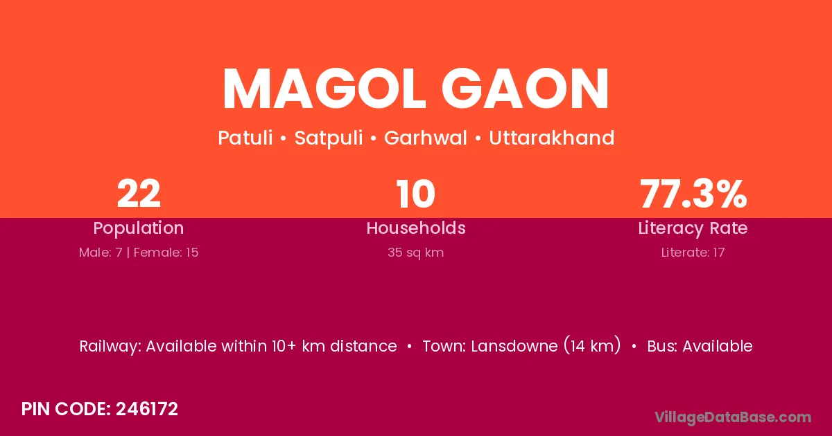 Lansdowne (14 km) is the nearest town to Magol Gaon village for major economic activities and is located approximately 14 km away.