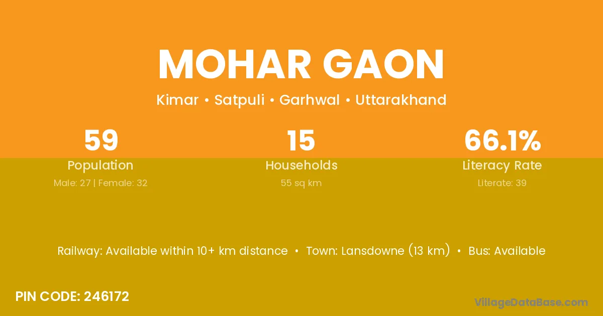 Lansdowne (13 km) is the nearest town to Mohar Gaon village for major economic activities and is located approximately 13 km away.