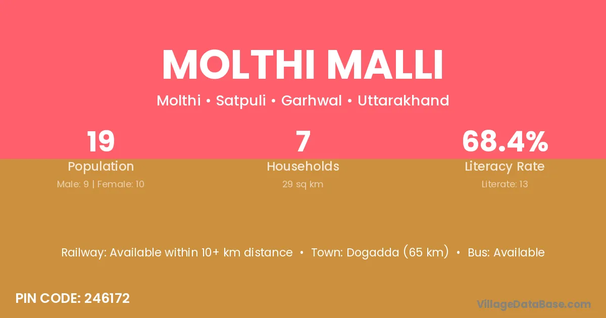 Molthi Malli village has a total population of 19 people, of which 9 are males and 10 are females.