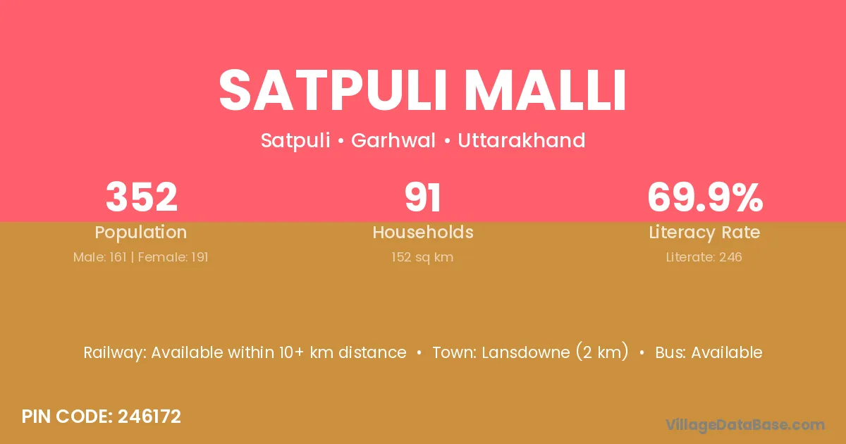 Lansdowne (2 km) is the nearest town to Satpuli Malli village for major economic activities and is located approximately 2 km away.