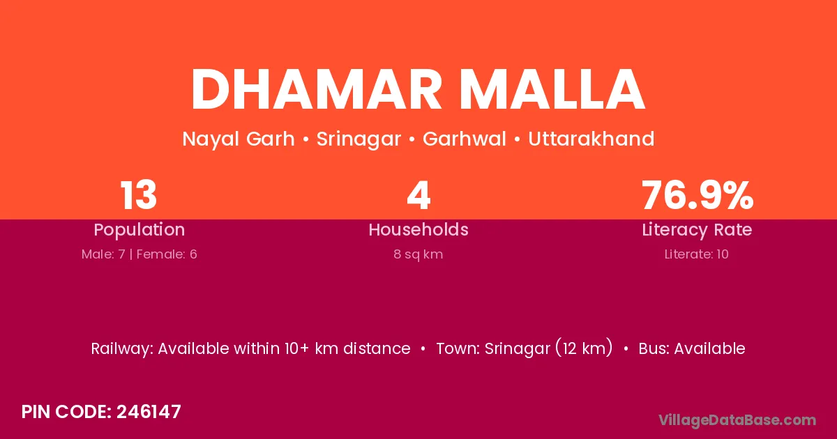 Dhamar Malla village has a total population of 13 people, of which 7 are males and 6 are females.