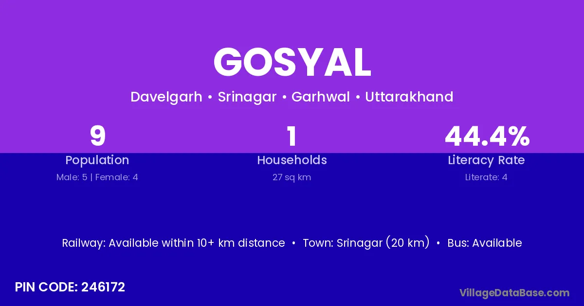 Srinagar (20 km) is the nearest town to Gosyal village for major economic activities and is located approximately 20 km away.