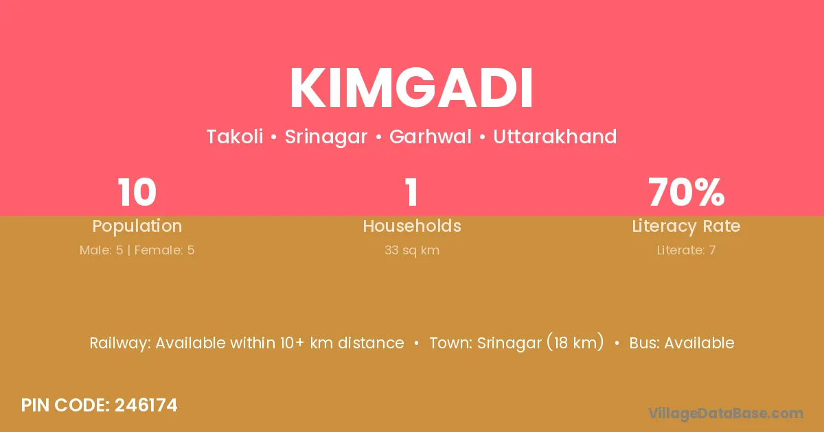 Srinagar (18 km) is the nearest town to Kimgadi village for major economic activities and is located approximately 18 km away.