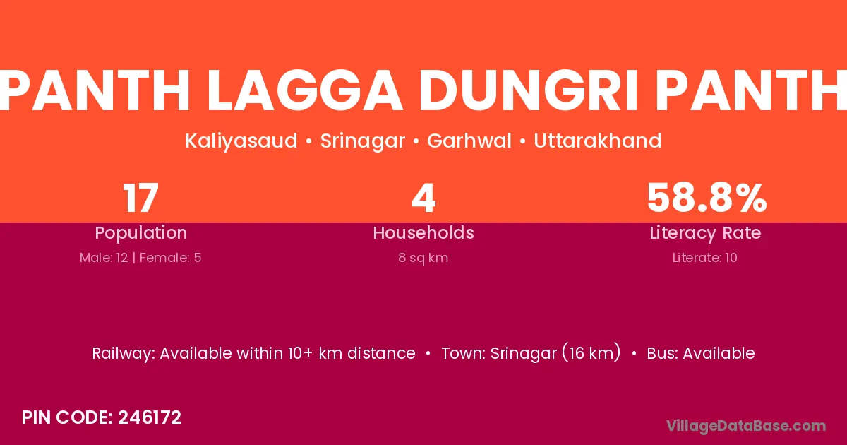 Panth Lagga Dungri Panth village has a total population of 17 people, of which 12 are males and 5 are females.