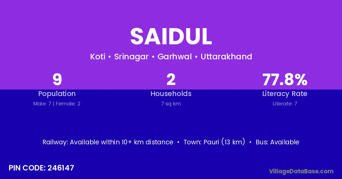 Pauri (13 km) is the nearest town to Saidul village for major economic activities and is located approximately 13 km away.