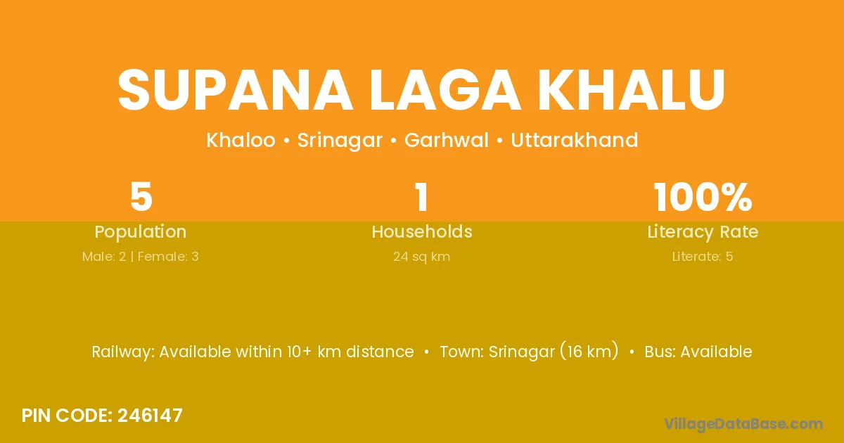 Supana Laga Khalu village has a total population of 5 people, of which 2 are males and 3 are females.