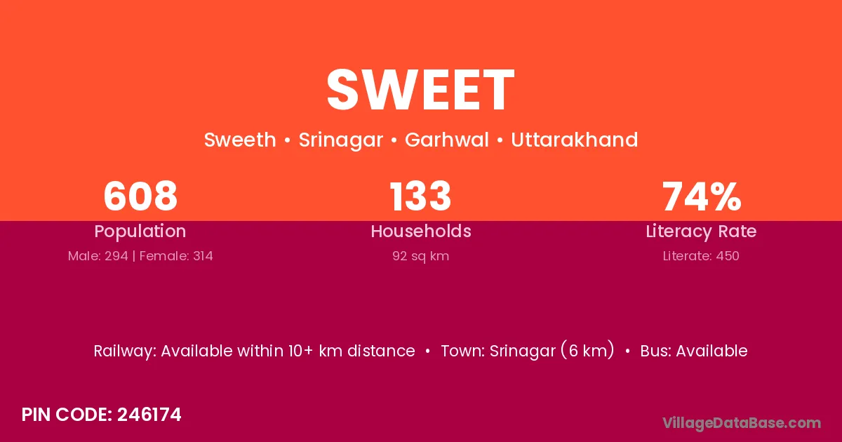 Srinagar (6 km) is the nearest town to Sweet village for major economic activities and is located approximately 6 km away.