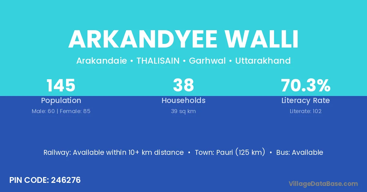 Pauri (125 km) is the nearest town to Arkandyee Walli village for major economic activities and is located approximately 125 km away.