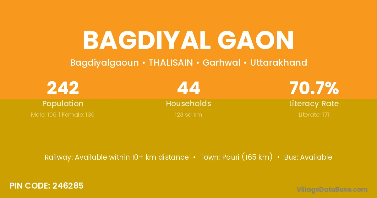 Pauri (165 km) is the nearest town to Bagdiyal Gaon village for major economic activities and is located approximately 165 km away.