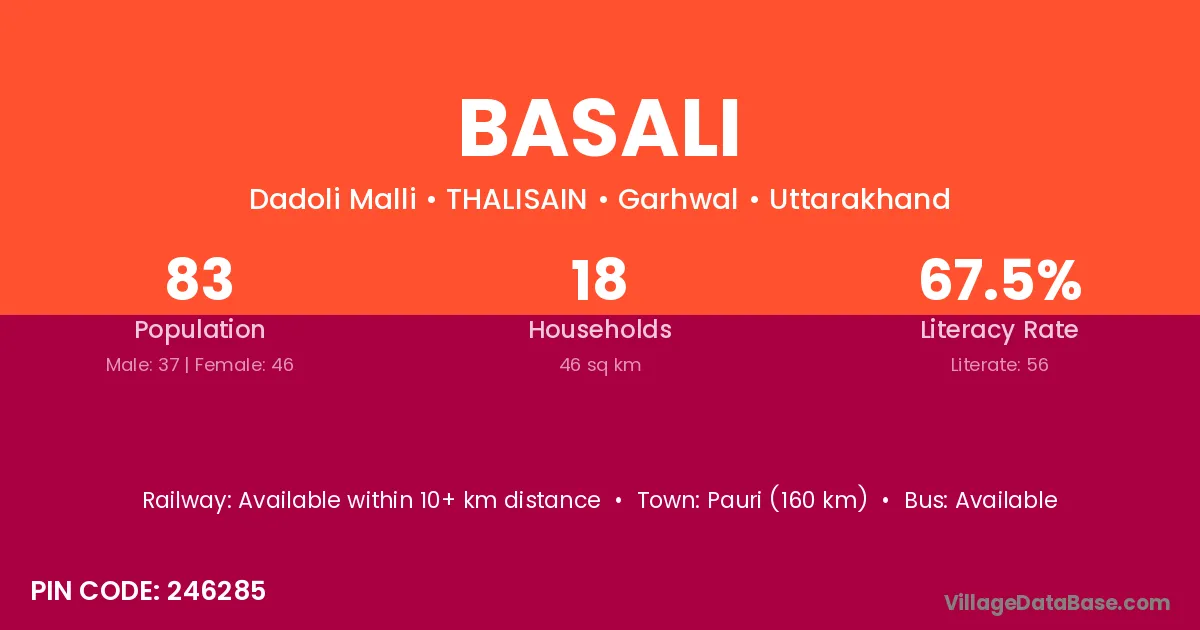 Pauri (160 km) is the nearest town to Basali village for major economic activities and is located approximately 160 km away.