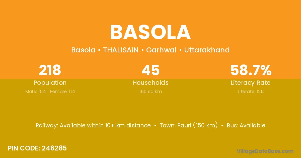 Pauri (150 km) is the nearest town to Basola village for major economic activities and is located approximately 150 km away.
