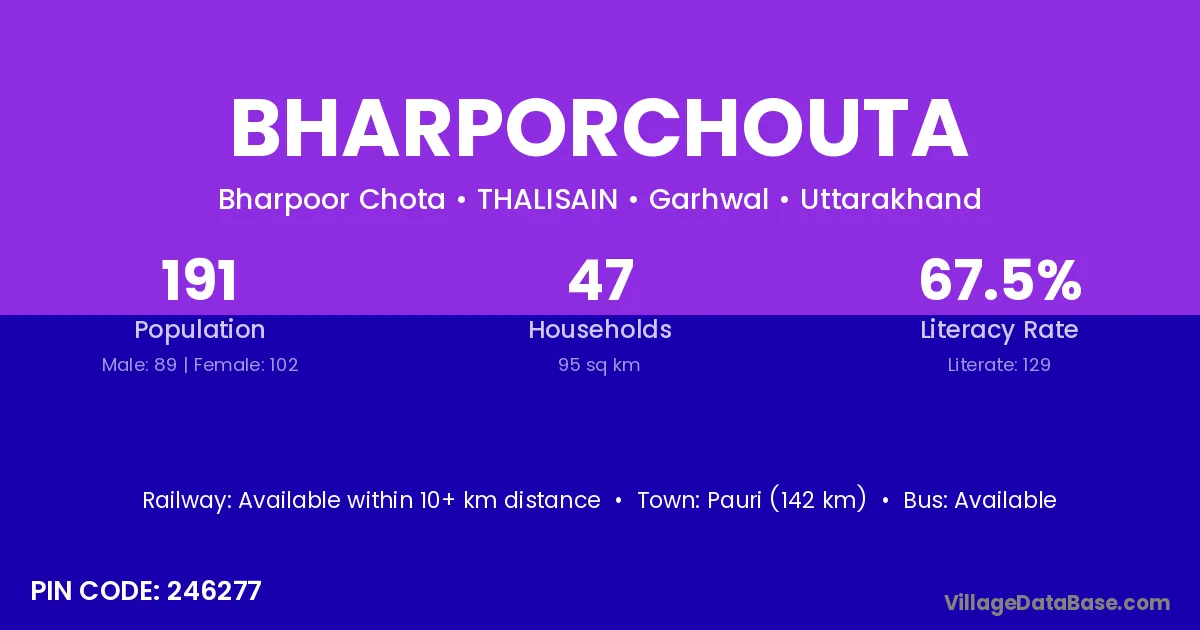 Pauri (142 km) is the nearest town to Bharporchouta village for major economic activities and is located approximately 142 km away.