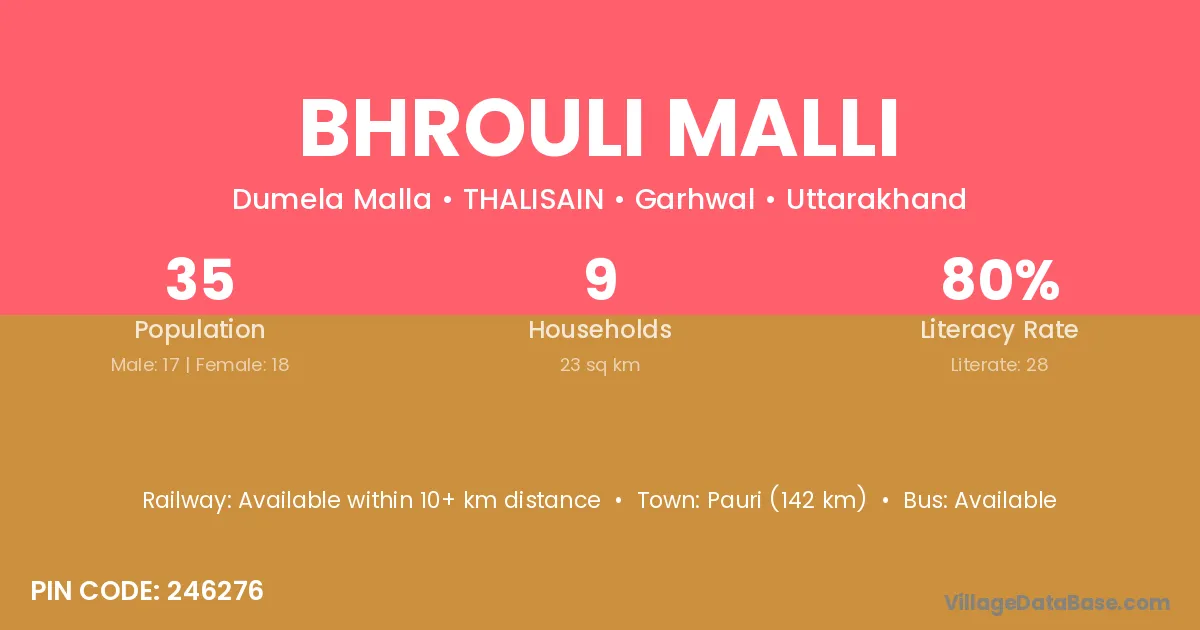 Pauri (142 km) is the nearest town to Bhrouli Malli village for major economic activities and is located approximately 142 km away.