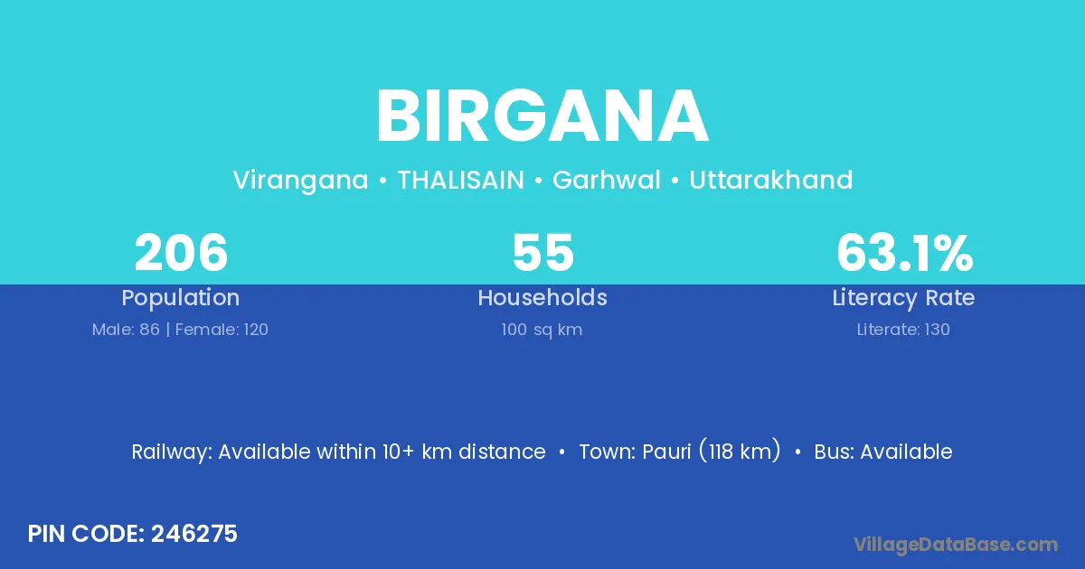 Pauri (118 km) is the nearest town to Birgana village for major economic activities and is located approximately 118 km away.