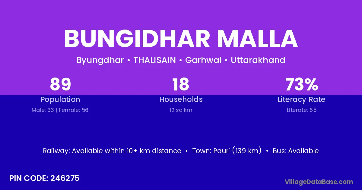 Pauri (139 km) is the nearest town to Bungidhar Malla village for major economic activities and is located approximately 139 km away.