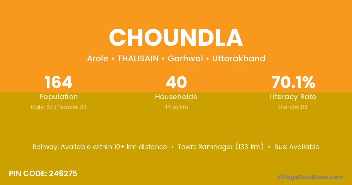 Choundla village has a total population of 164 people, of which 82 are males and 82 are females.