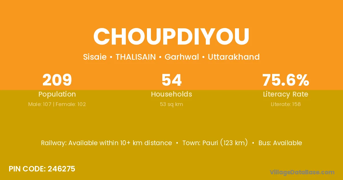 Pauri (123 km) is the nearest town to Choupdiyou village for major economic activities and is located approximately 123 km away.