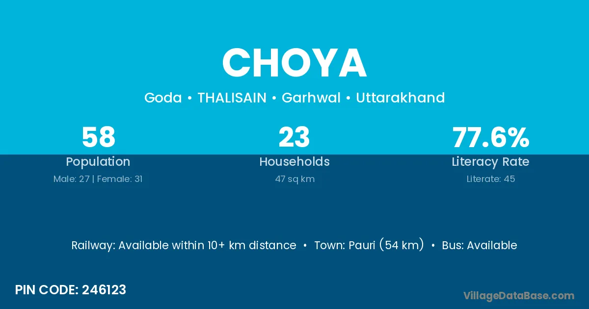 Pauri (54 km) is the nearest town to Choya village for major economic activities and is located approximately 54 km away.