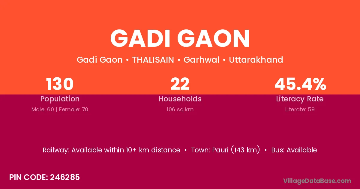 Pauri (143 km) is the nearest town to Gadi Gaon village for major economic activities and is located approximately 143 km away.