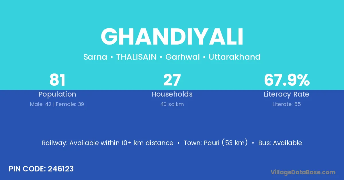 Pauri (53 km) is the nearest town to Ghandiyali village for major economic activities and is located approximately 53 km away.
