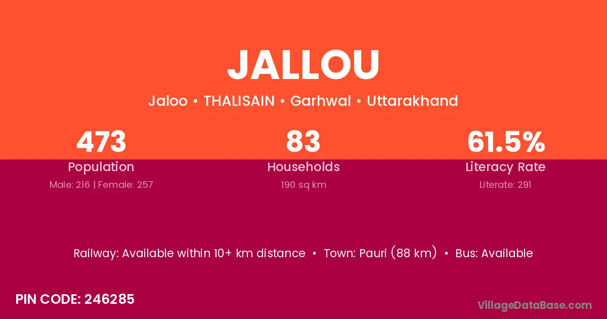 Pauri (88 km) is the nearest town to Jallou village for major economic activities and is located approximately 88 km away.