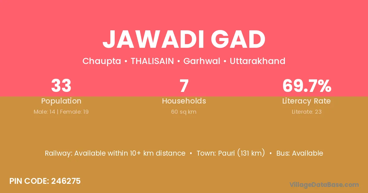 Pauri (131 km) is the nearest town to Jawadi Gad village for major economic activities and is located approximately 131 km away.