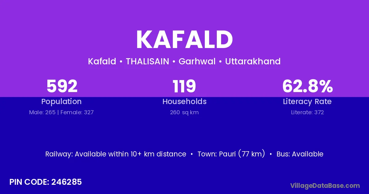Pauri (77 km) is the nearest town to Kafald village for major economic activities and is located approximately 77 km away.