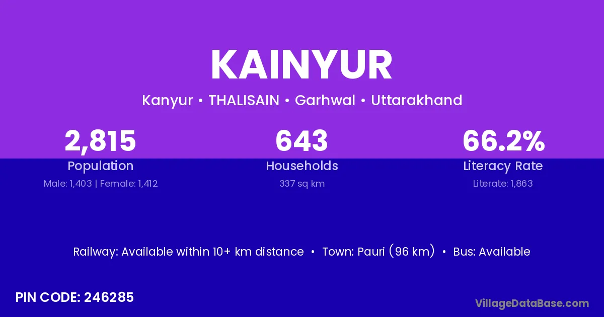 Pauri (96 km) is the nearest town to Kainyur village for major economic activities and is located approximately 96 km away.