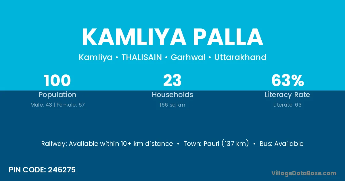 Pauri (137 km) is the nearest town to Kamliya Palla village for major economic activities and is located approximately 137 km away.