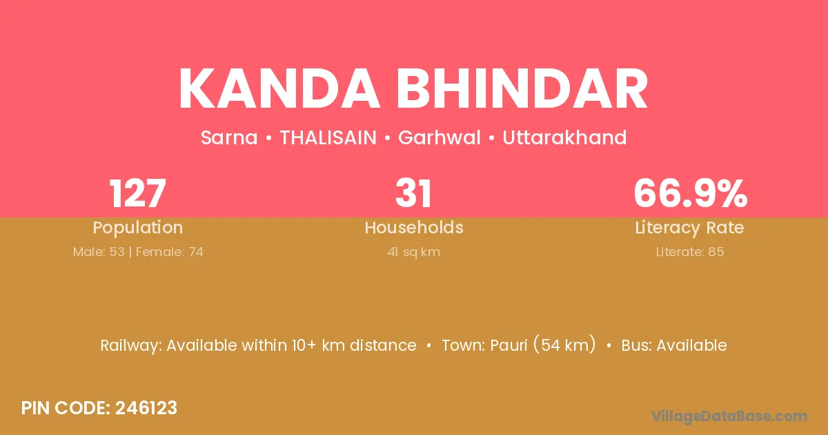 Pauri (54 km) is the nearest town to Kanda Bhindar village for major economic activities and is located approximately 54 km away.