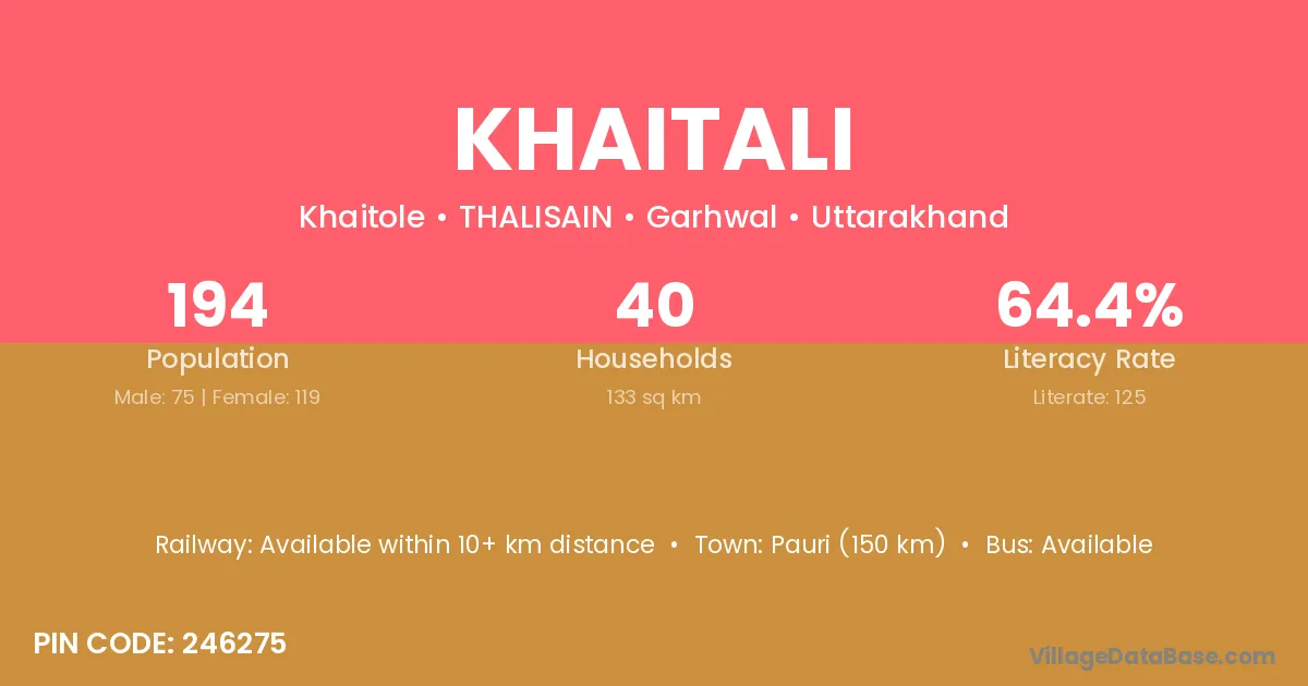 Pauri (150 km) is the nearest town to Khaitali village for major economic activities and is located approximately 150 km away.