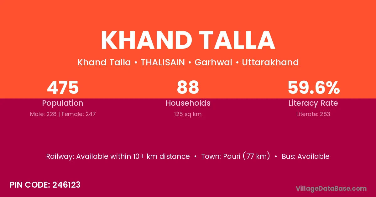 Pauri (77 km) is the nearest town to Khand Talla village for major economic activities and is located approximately 77 km away.