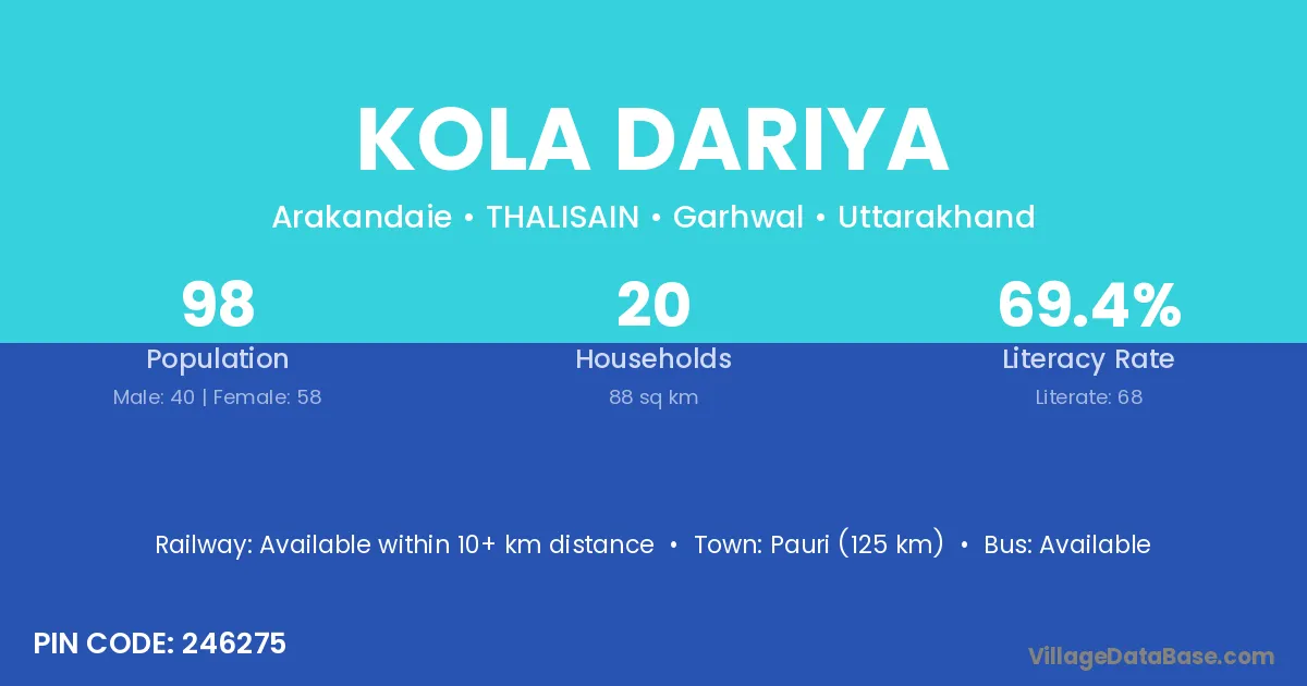 Pauri (125 km) is the nearest town to Kola Dariya village for major economic activities and is located approximately 125 km away.