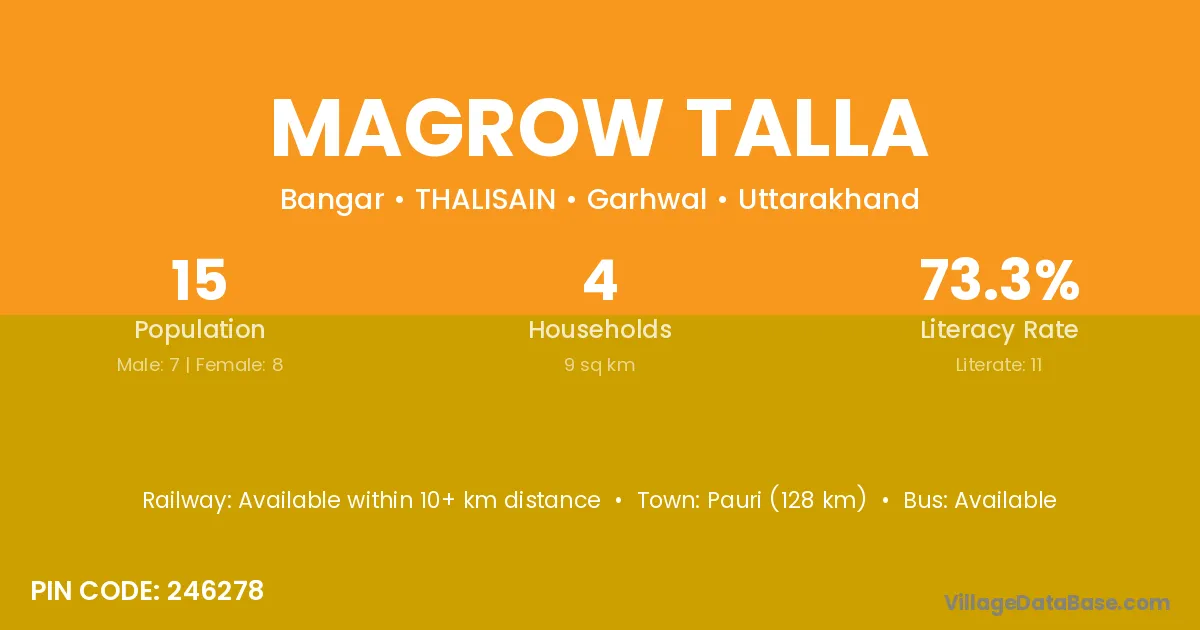 Pauri (128 km) is the nearest town to Magrow Talla village for major economic activities and is located approximately 128 km away.
