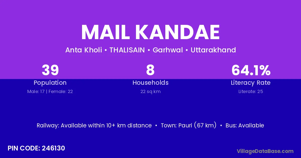 Pauri (67 km) is the nearest town to Mail Kandae village for major economic activities and is located approximately 67 km away.