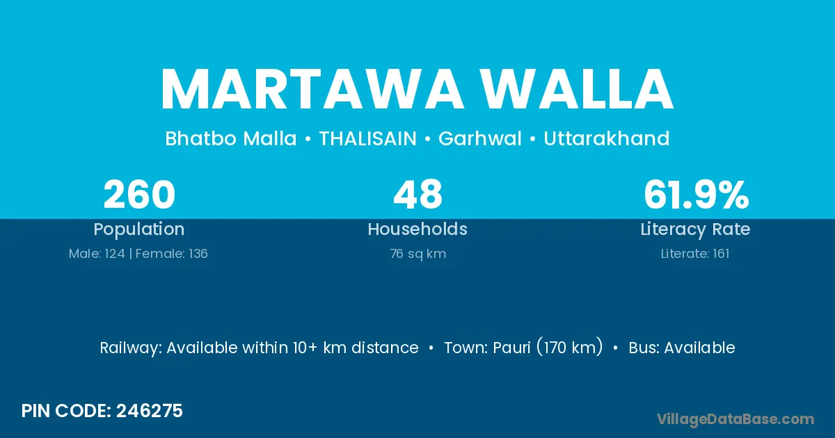 Pauri (170 km) is the nearest town to Martawa Walla village for major economic activities and is located approximately 170 km away.