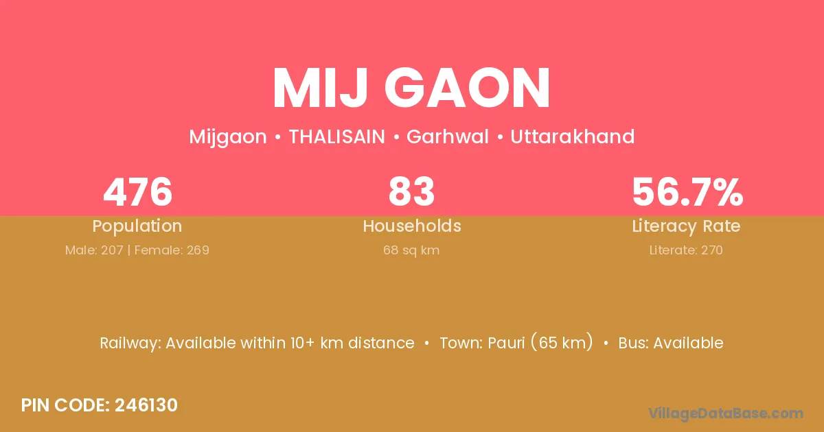 Pauri (65 km) is the nearest town to Mij Gaon village for major economic activities and is located approximately 65 km away.