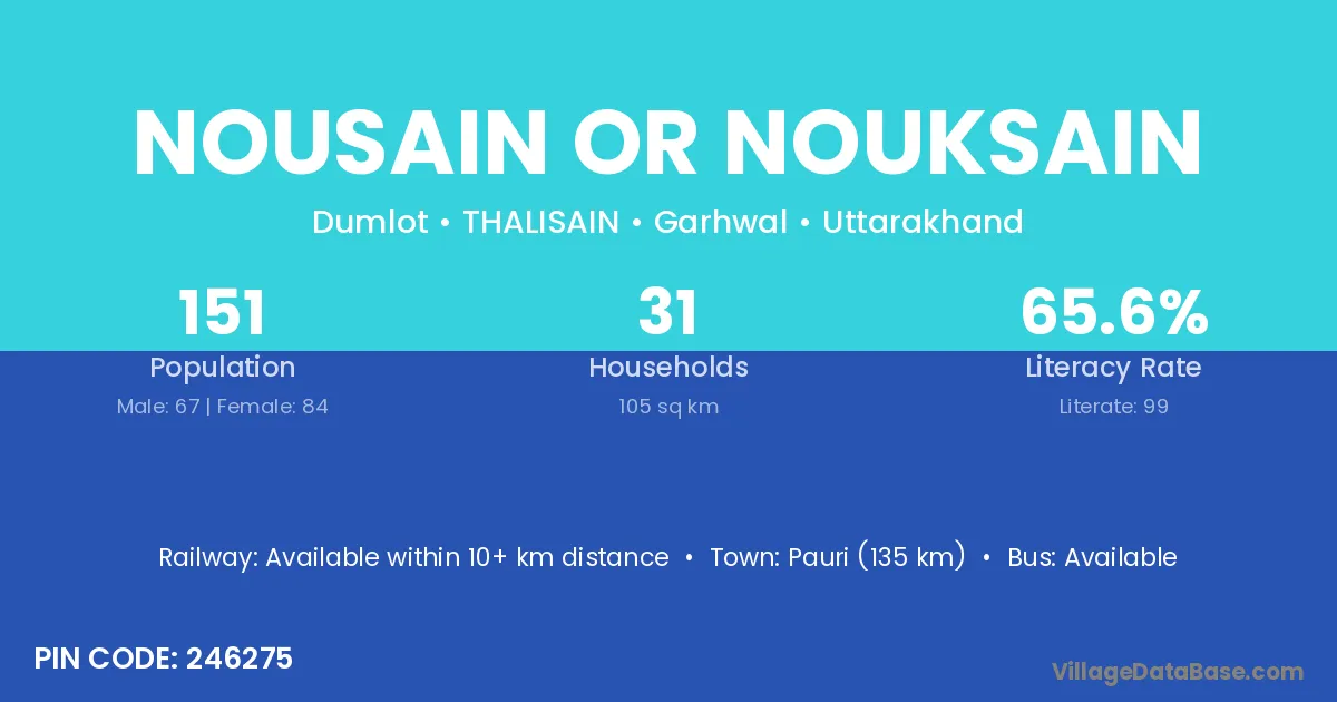 Pauri (135 km) is the nearest town to Nousain Or Nouksain village for major economic activities and is located approximately 135 km away.