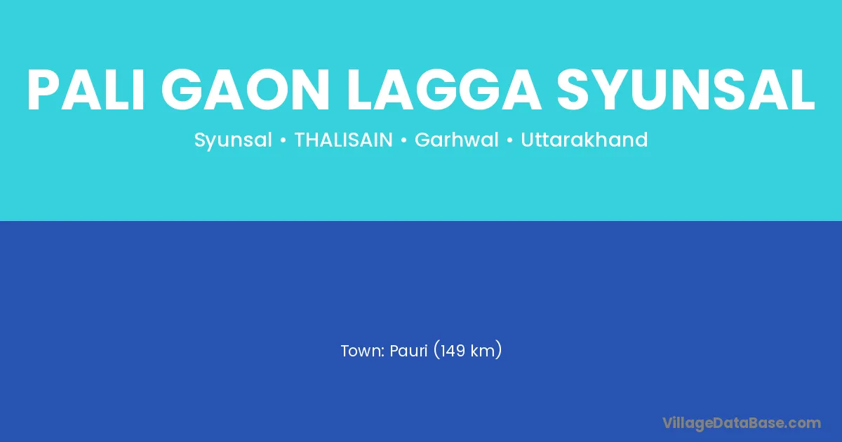 Pauri (149 km) is the nearest town to Pali Gaon Lagga Syunsal village for major economic activities and is located approximately 149 km away.