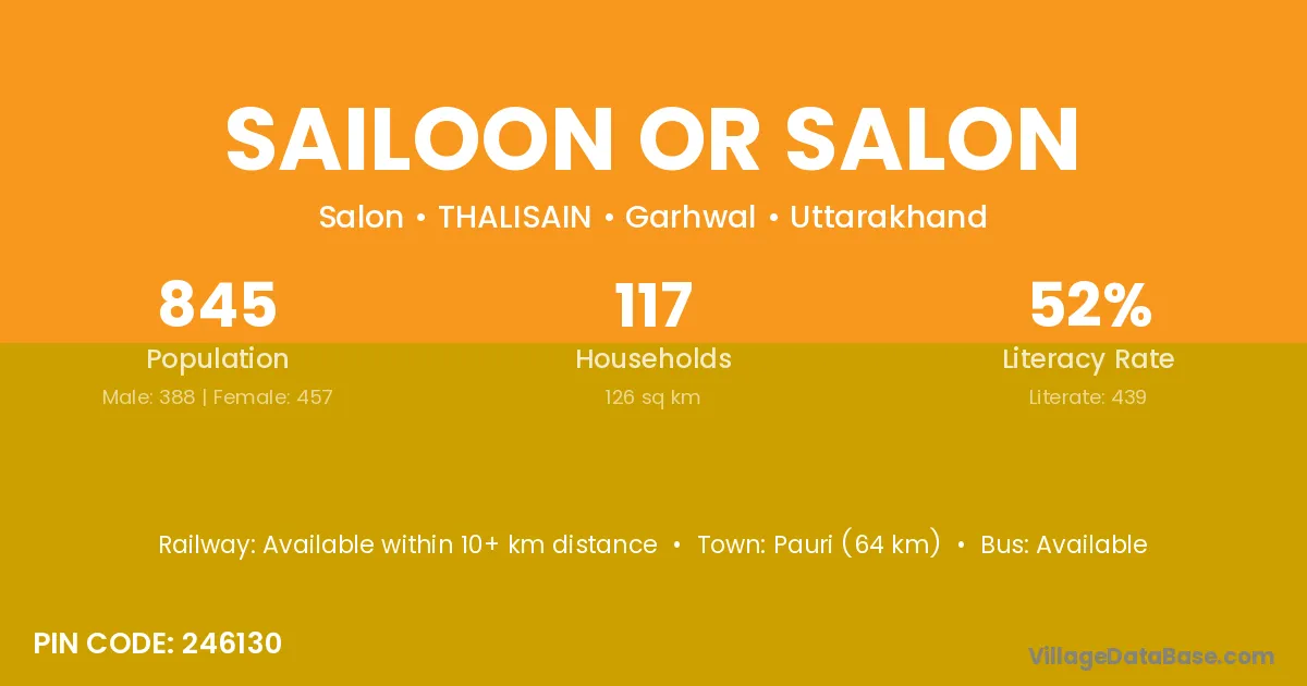 Pauri (64 km) is the nearest town to Sailoon Or Salon village for major economic activities and is located approximately 64 km away.