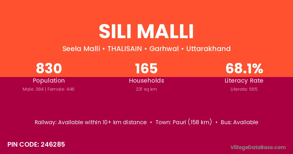 Pauri (158 km) is the nearest town to Sili Malli village for major economic activities and is located approximately 158 km away.