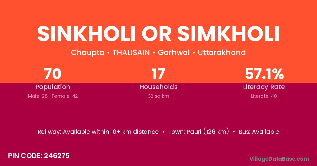 Pauri (126 km) is the nearest town to Sinkholi Or Simkholi village for major economic activities and is located approximately 126 km away.