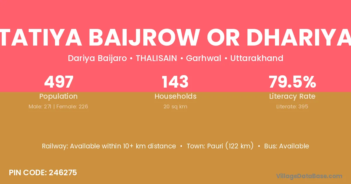 Tatiya Baijrow Or Dhariya village has a total population of 497 people, of which 271 are males and 226 are females.