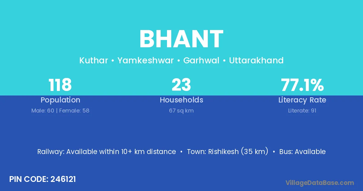 Rishikesh (35 km) is the nearest town to Bhant village for major economic activities and is located approximately 35 km away.