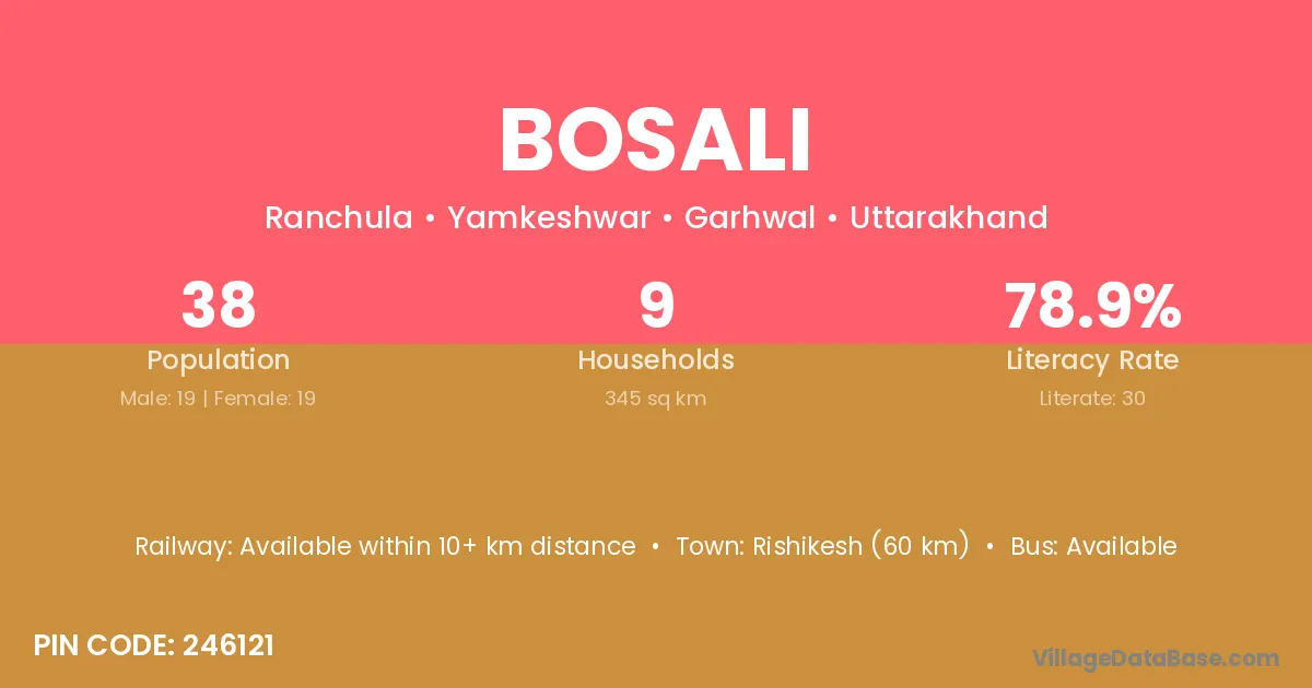 Rishikesh (60 km) is the nearest town to Bosali village for major economic activities and is located approximately 60 km away.